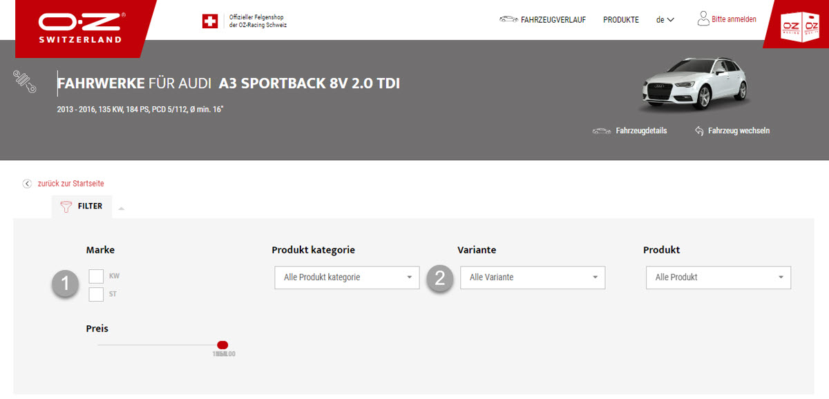 Schränke die Auswahl nach Marke (KW oder ST) ein (1) oder Grenze die Variante auf dein Bedürfnis aus (2) und Entdecke viele weitere Möglichkeiten.